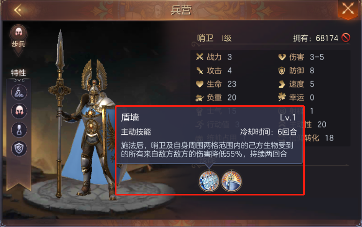 哨卫的技能在三大种族步兵中,属于最优秀的,主动、被动都是减伤。作为一个前排,拥有双减伤技能肯定是能极大的减少受到的伤害,前排坚持的越久,则远程的输出越高。