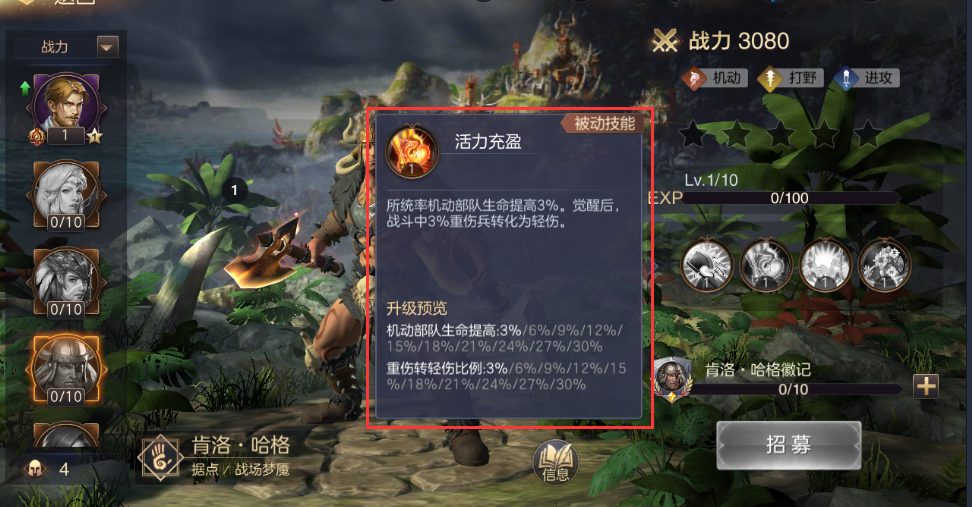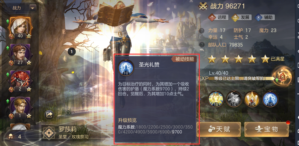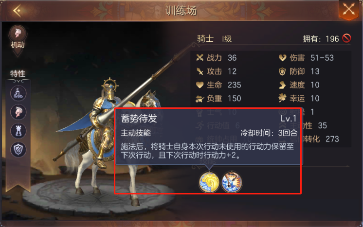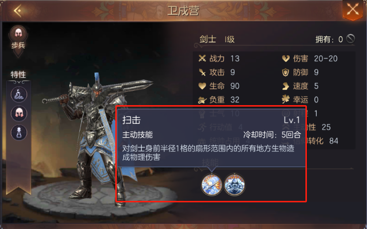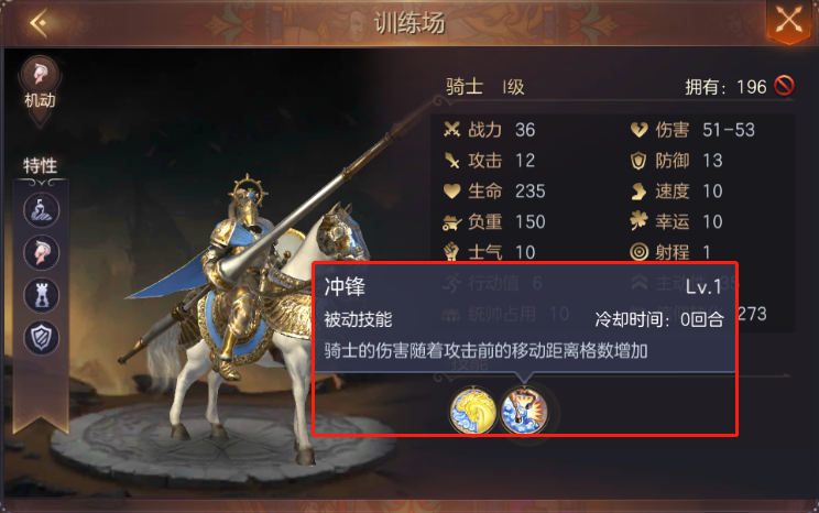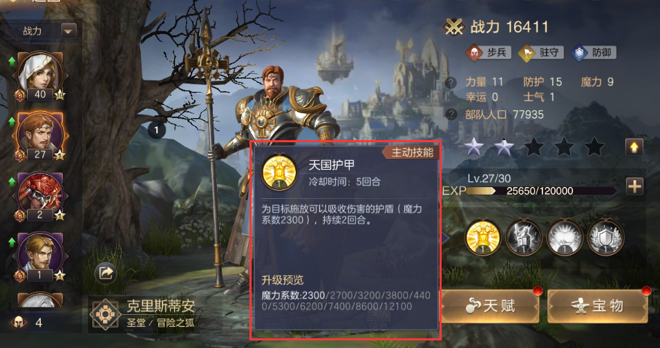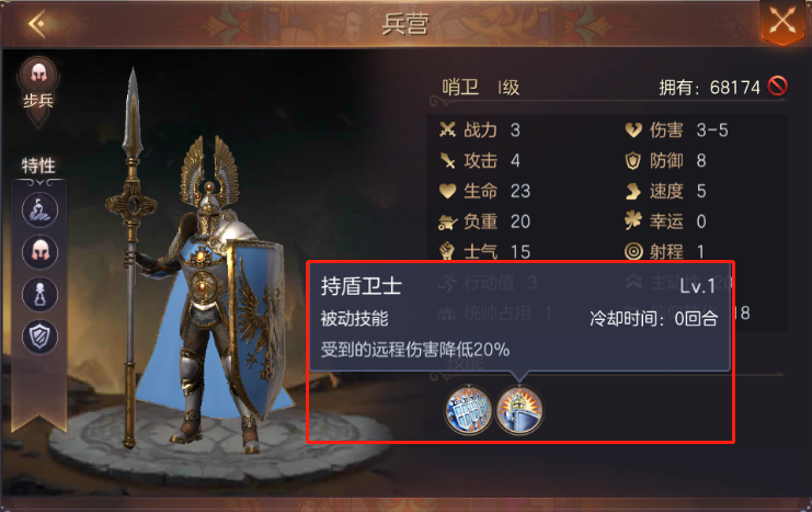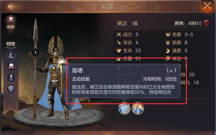 前期圣堂会送一个加盾的紫色英雄克里斯蒂安,主动技能可以给队友加一个强力的盾。你经常带他出去就会发现这个盾是优先加给前排的步兵。有了强力的护盾加上步兵高额的免伤可以最大化的减少自己前排的损失。(在打架之中绝大多数的输出都是优先攻击前排步兵,在是机动和远程。步兵的存活可以极大的减少后排的损失。)作为出战的主将推荐优先把防御和步兵的被动技能点出来。有条件的情况下把防御点满。
