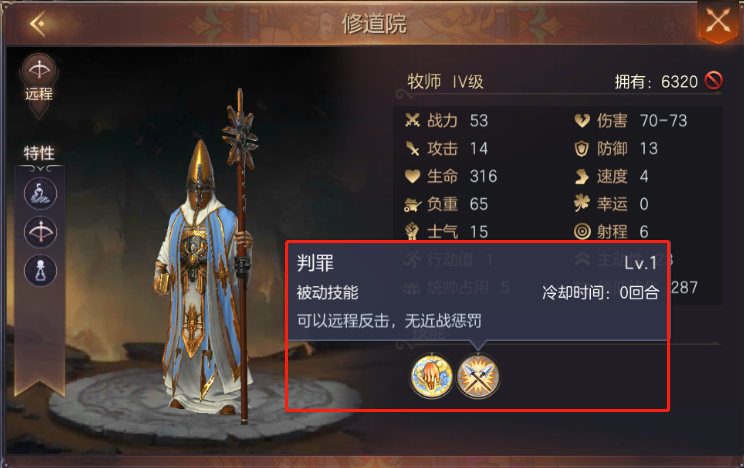 圣堂种族的核心输出,自带反击、无近战惩罚、治疗、高伤害,他就是你队伍里的核心,你队伍的输出50%左右是他打出来的,真正的带你们躺赢的大佬,队伍中必不可少的兵种。