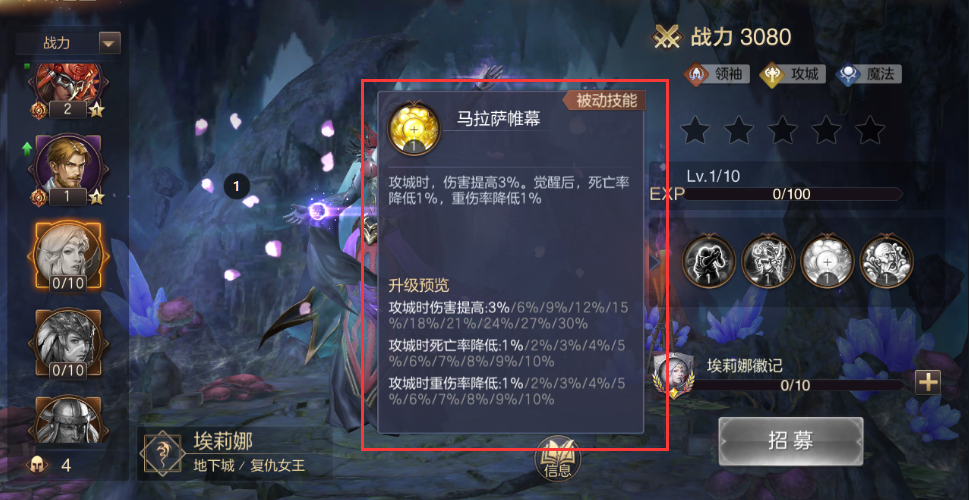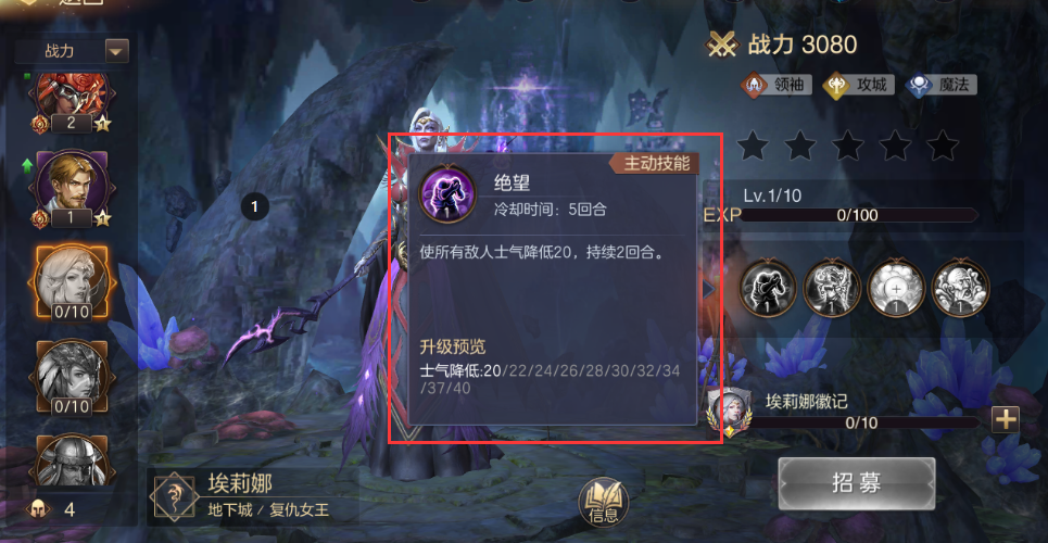 复仇女王埃莉娜为攻城略地而存在,可以减少自己攻城时候的损伤,降低敌人士气让自己有更多的出手机会,配合好自己兵种的爆发可以直接碾压对方。(技能天赋推荐首先把攻城点满。再点满领袖天赋的顺序。最后再考虑魔法天赋。降低士气不用点天赋树就可以直接使用。)