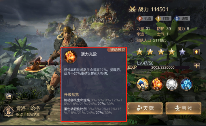 凯瑟琳可以说是全面英雄,当之无愧,驻守主城时可以增加队伍血量和重伤率降低30%,可以说这是一个神技。我们在守城不会阵亡,只会重伤与轻伤,各50%,重伤后会进帐篷,治疗好前无法参战,但是轻伤可以再次参战,所以降低重伤率就是增加自己的守城战力。