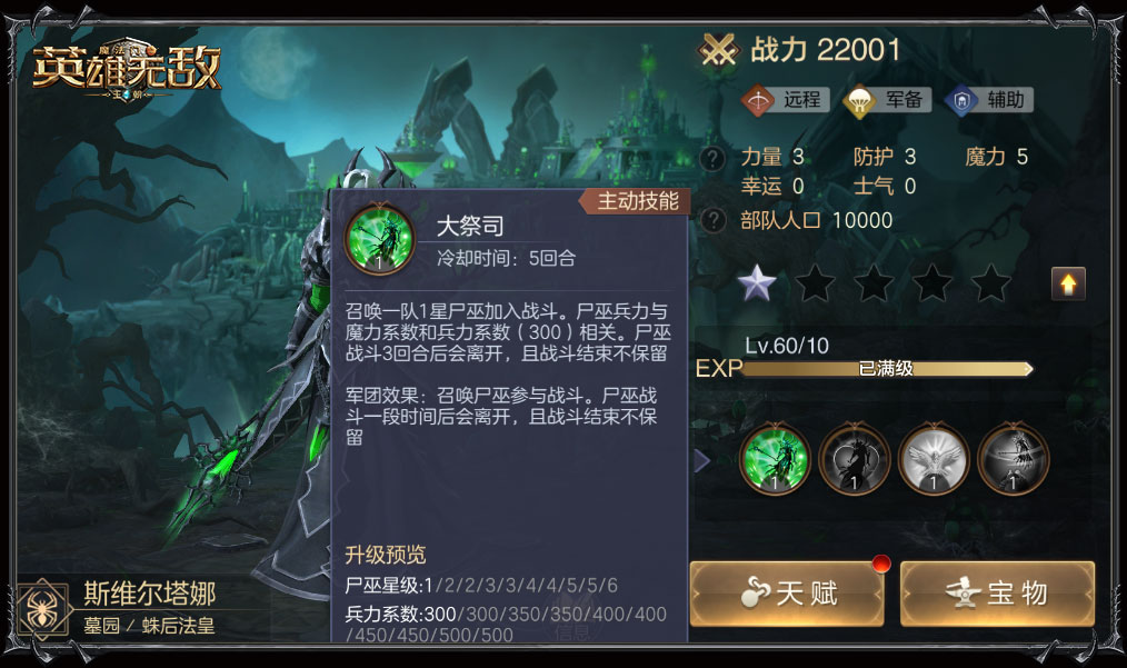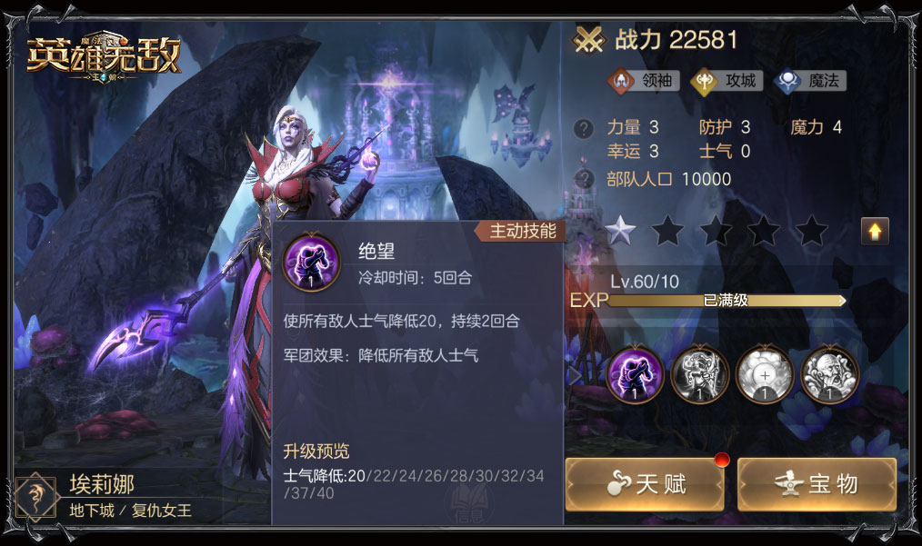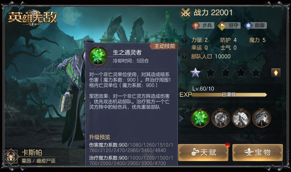 可高效回复生命的墓园一直是战场上的核心,该种族的当家英雄们的输出效果也是有目共睹。当夺魂者凡恩附加降低敌人士气的军团效果,与自身主动技能结合后,战斗主动权更是紧握在手,要知道士气太低时哪怕轮到攻击时,也有可能被跳过。虚弱对手、降低防御,其他几位英雄在此之外还有锁定式伤害效果,这点图片更为直观。