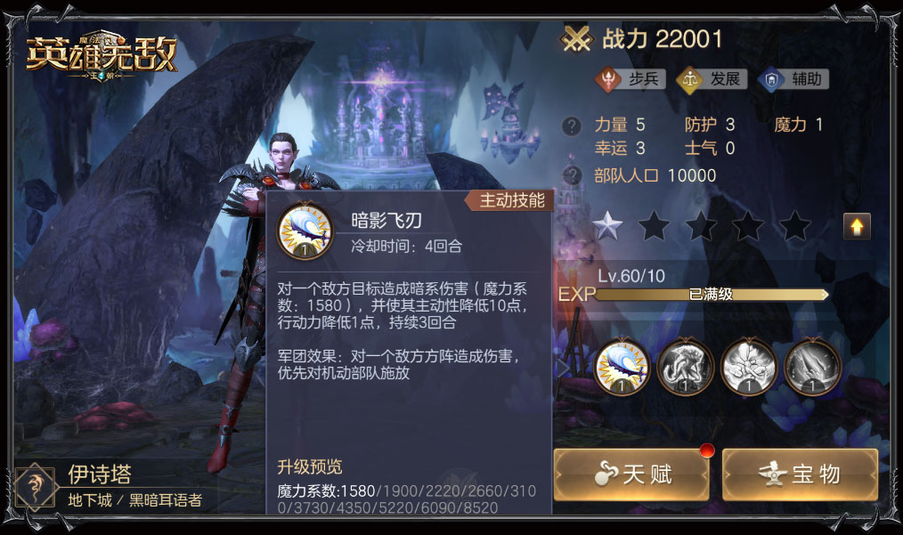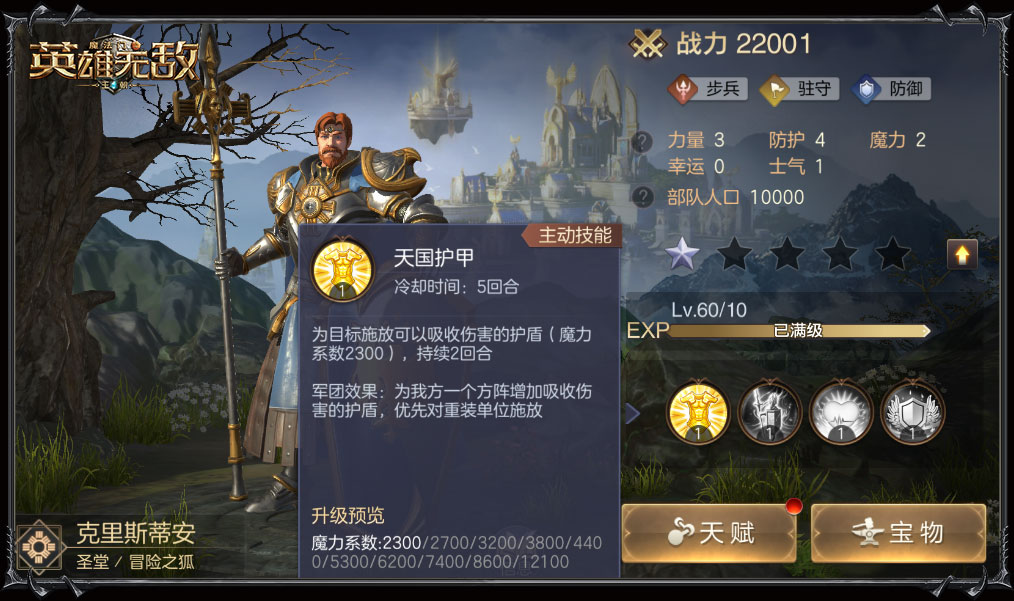 防护能力了得的据点英雄,要是再穿上一层铠甲,大地图上岂不是要横行。超强悍的伊士军团效果下可为全体友方增加护盾,搭配上主动技能增加的吸收伤害的护盾,战场也能开启双保险模式。据点其他英雄的军团效果也不容小觑,可参看下图提前了解。