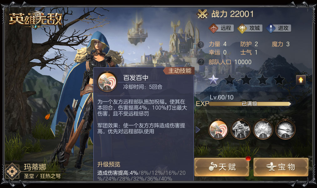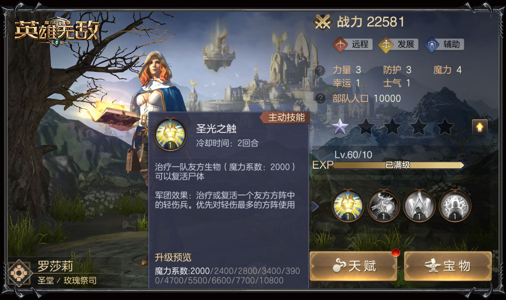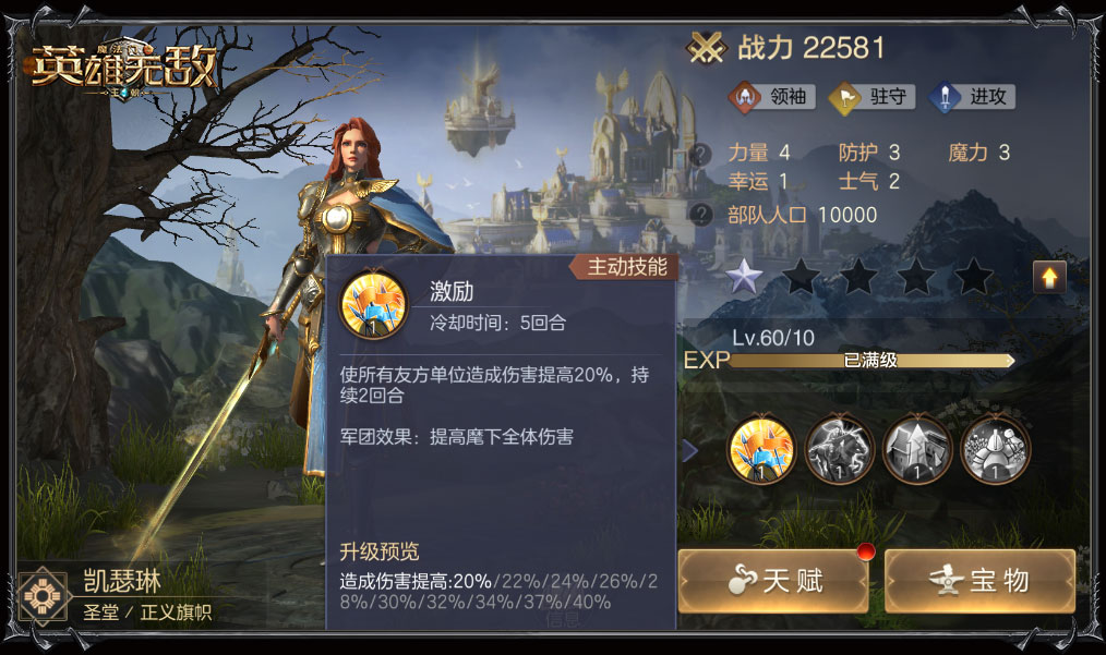 光明的圣堂是战场的希望,拥有超强步兵的他们总是冲锋在前。激活军团效果的凯瑟琳女王可在主动技能外再提高麾下全体伤害,为战场注入一剂强心针。罗莎莉的治疗效果也在军团技能中被发挥到最大,优先治疗轻伤或复活,时刻保证战场基础战斗力。圣堂英雄军团效果细节见下图,各位领主可抢先了解。