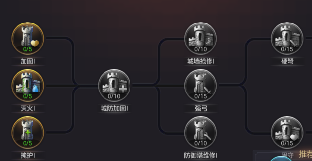 1. 城墙方面有:城防加固(增加城防值)、灭火(减少着火的时间)、掩护(增加防御塔承担攻城伤害的占比,减少城墙受到的伤害)、城墙抢修 (增加城墙的回复速度)